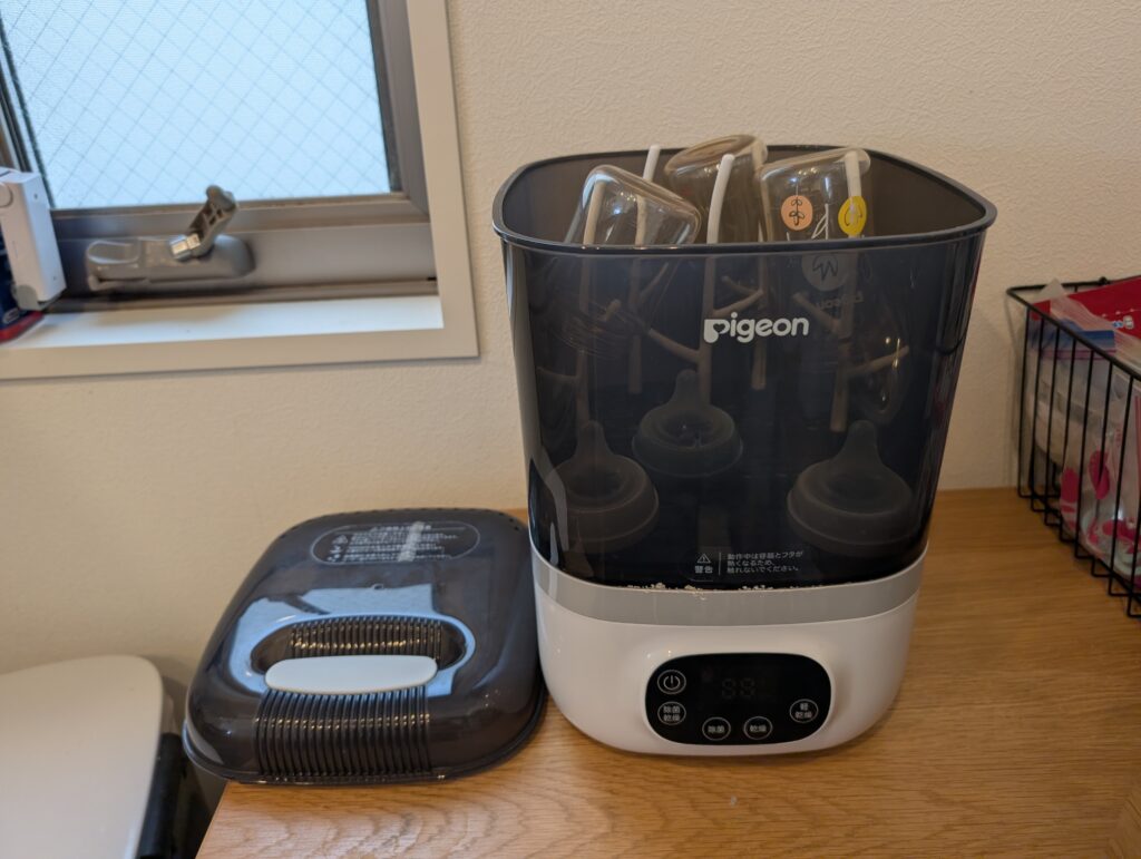 1人目の時はレンジでチンするタイプを使っていました。でも、使っていた哺乳瓶がレンジ不可になったこともあり、思い切って「スチーム除菌・乾燥器のポチット」を導入。
