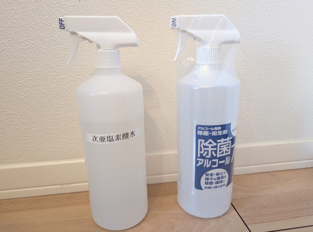 我が家は「次亜塩素酸の素」を買って、家で作っておいて、すぐに取り出せるようにしてる。